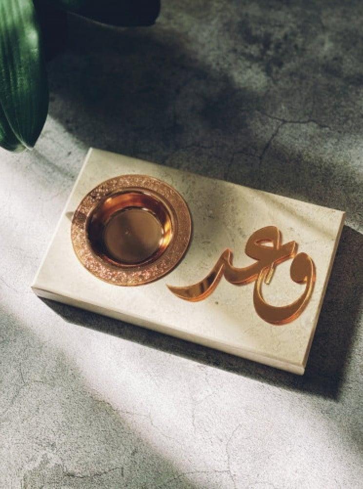 مبخرة مكتبية أو طاولة مصنوعة من أفخم أنواع الرخام الطبيعي، بتصميم يدوي فاخر يحمل اسمك بمادة الأكريليك الذهبي لتضفي لمسة راقية على أي مساحة. مثالية لعشاق التميز والتفاصيل الفريدة في الديكور.