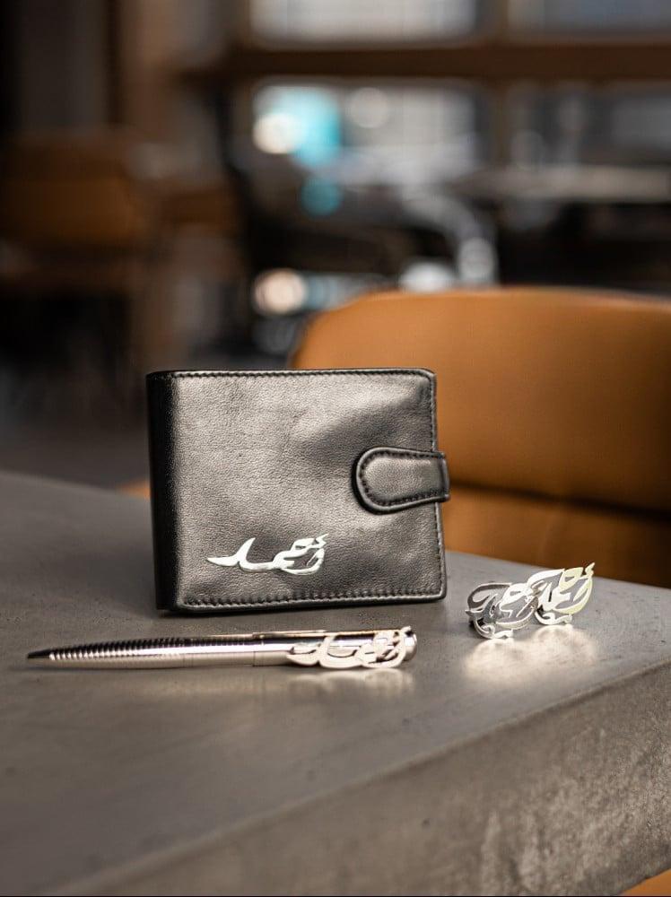 يتكون من 3 قطع أنيقة: كبك مزدوج، قلم فاخر، ومحفظة بتصميم عصري – جميعها تُنقش بالاسم حسب الطلب وتأتي بتغليف فاخر يليق بالمناسبة.